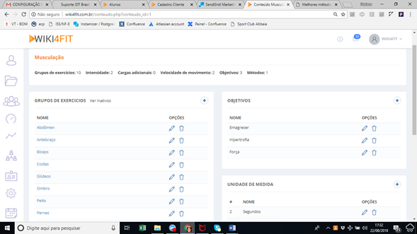 Este menu é fundamental para você adicionar vídeos, criar e gerenciar seu conteúdo de: tipos de treino, grupos de atividades ou esportes, grupos musculares, exercícios, unidade de medida, objetivos, velocidade de execução, entre outros.